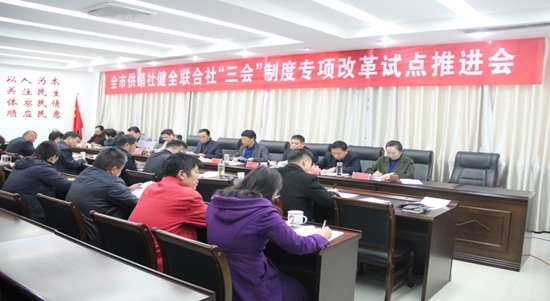 11月1日, 驻马店市供销社健全联合社“三会”制度专项改革试点工作推进会召开。会议的主要任务是安排市社和遂平、上蔡县社健全联合社“三会”制度专项试点工作,部署市社第一次代表大会的筹备工作,动员市社机关各科室、直属各单位进一步提高认识,明确任务,落实责任,细化措施,以更扎实、更到位、更富有成效的工作,确保“一代会”圆满胜利召开。 驻马店供销社理事会主任姚占勋, 驻马店供销社健全联合社“三会”制度专项改革总顾问李斌出席会议并分别作重要讲话。 驻马店社机关全体同志和相关人员参加会议。